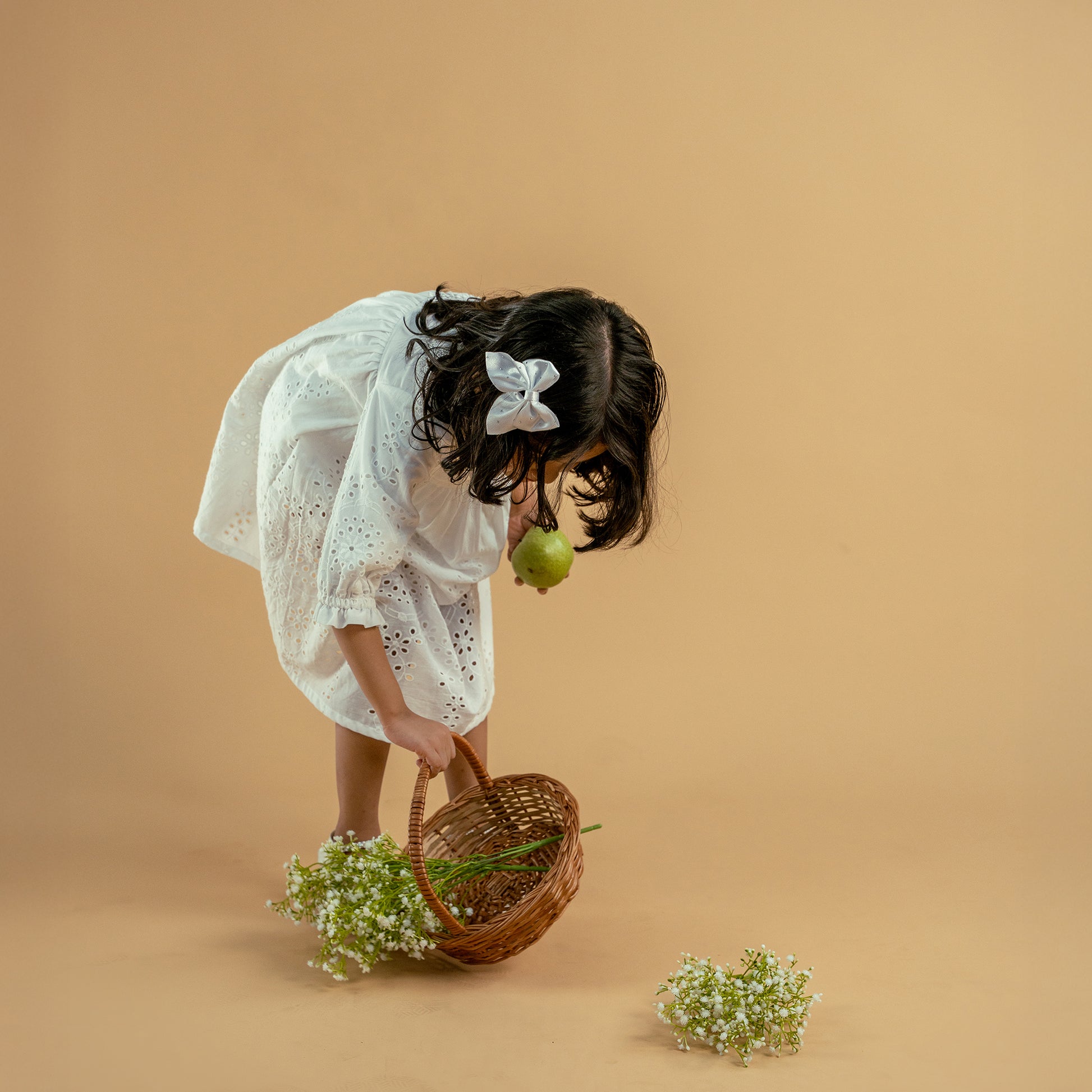 A vision of delicate charm for your little one. Crafted from exquisite Hakoba fabric, this dress features a unique petal collar that frames the face beautifully. The 3/4 sleeves are finished with playful ruffles, adding a touch of whimsy. Soft gathers at the yoke create a gentle, flattering silhouette, ensuring both comfort and elegance.