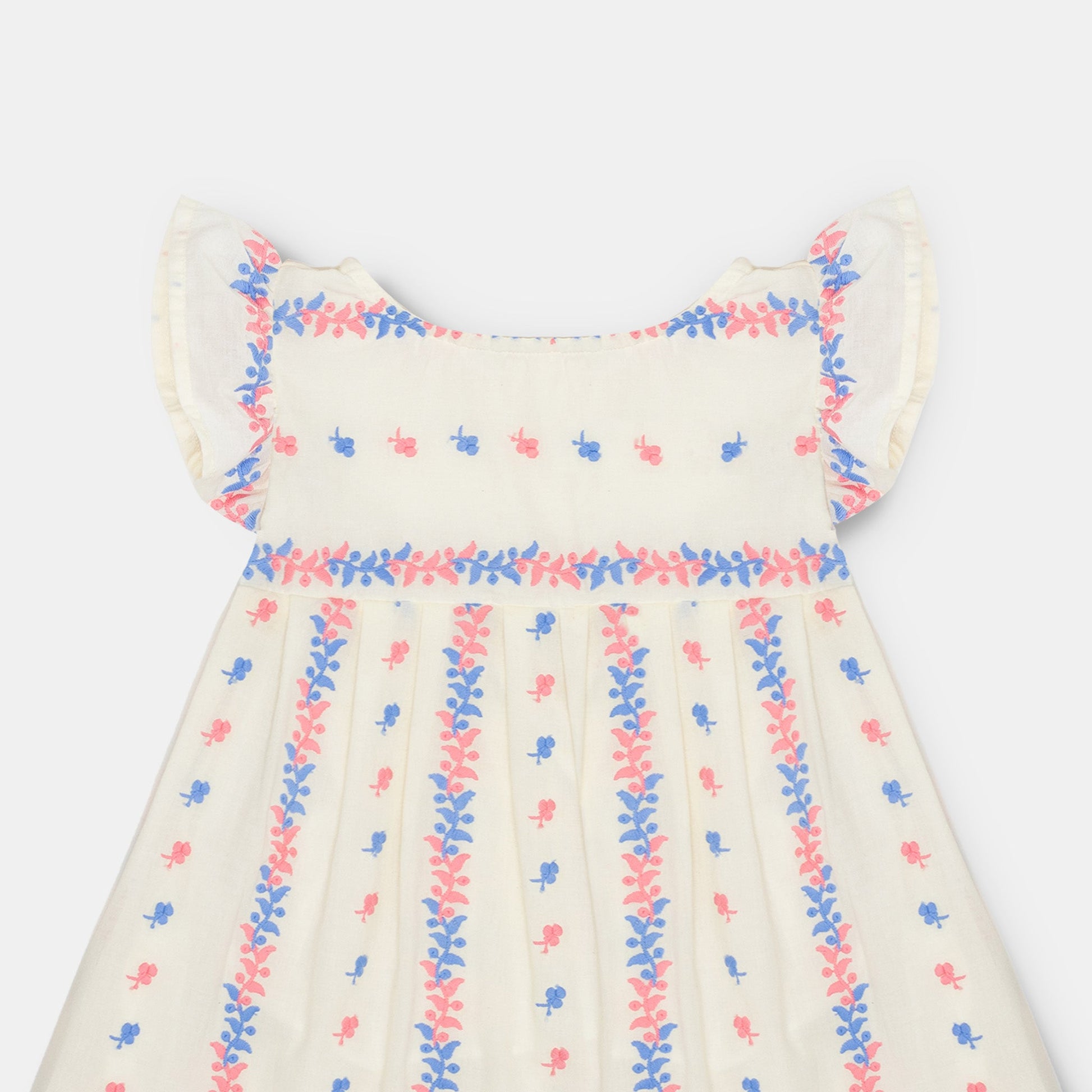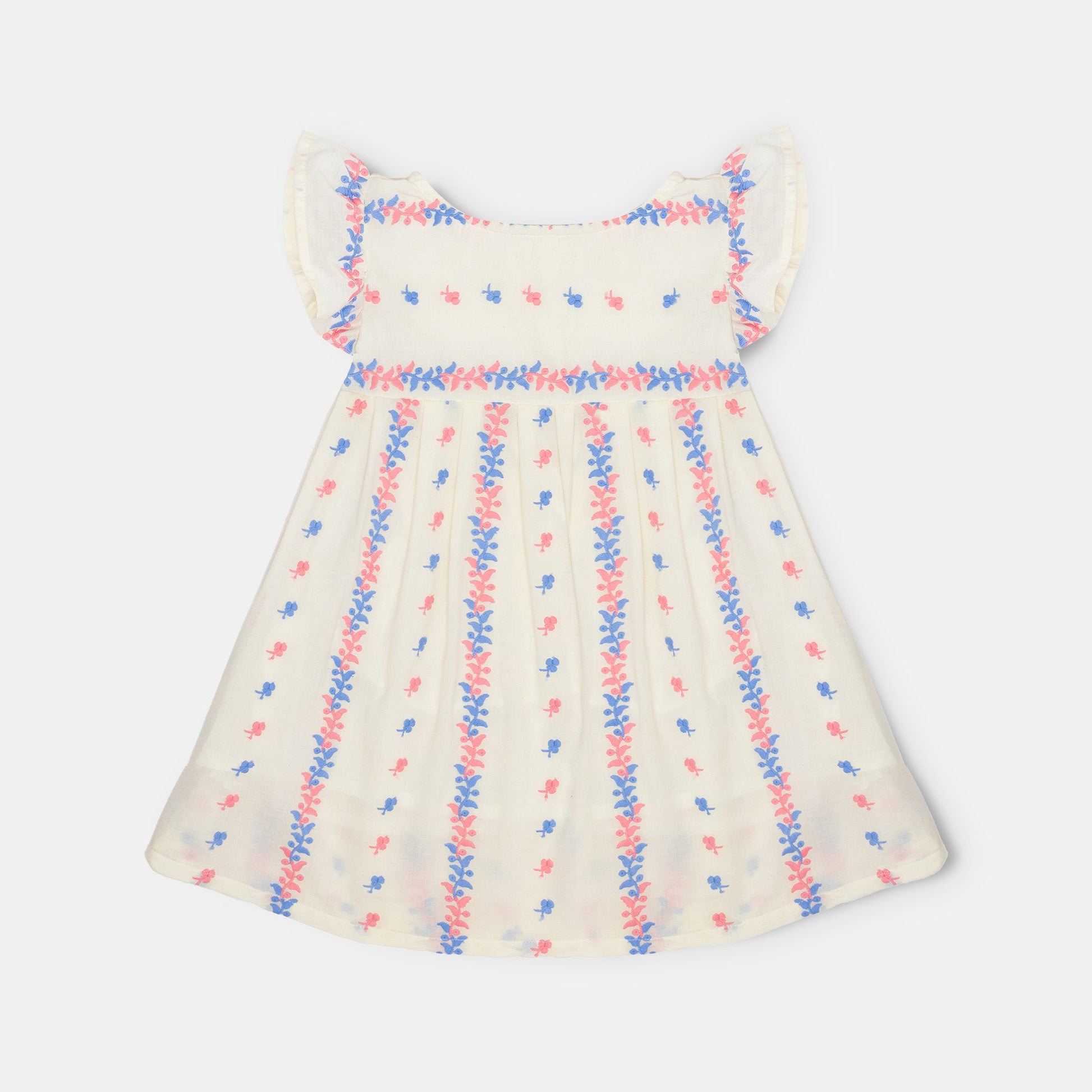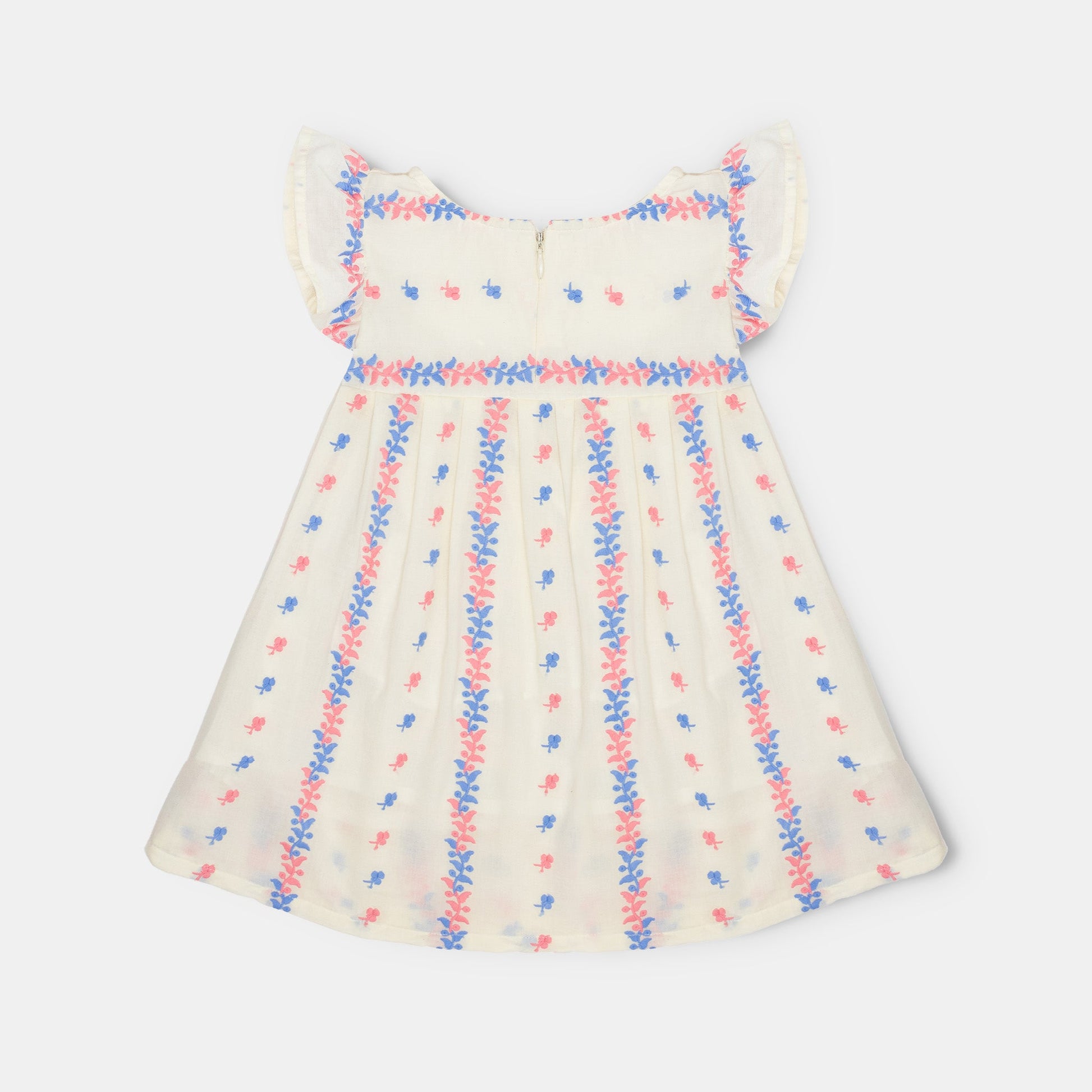 Your little one will flutter with joy in this off white dress with delicate floral embroidery. The flutter sleeves add a playful touch to this girly dress. Perfect for any occasion!