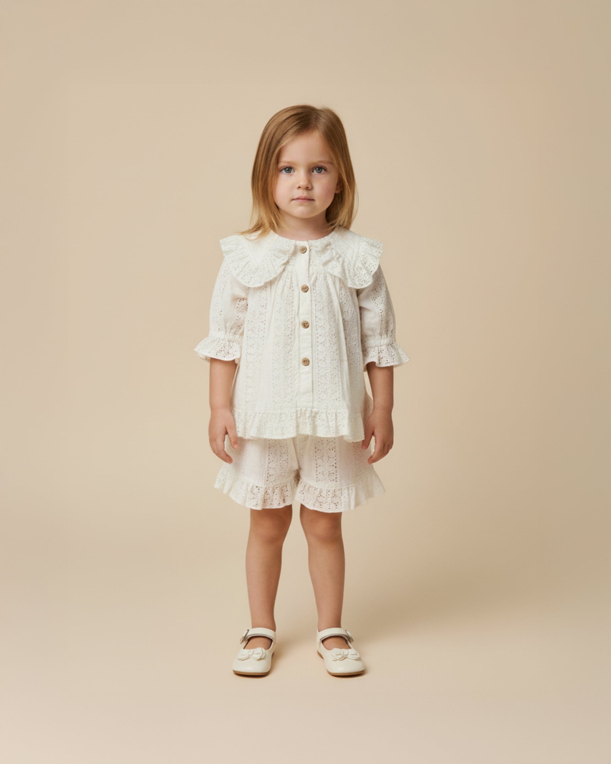 Our White Hakkoba Ruffle Set is a delightful two-piece outfit perfect for your little one. Made from soft and breathable Hakkoba fabric, this set features charming ruffles and gathers on both the shirt top and shorts, adding a touch of playful elegance. The half sleeves with added ruffles complete this sweet and comfortable ensemble, ideal for sunny days and special moments.